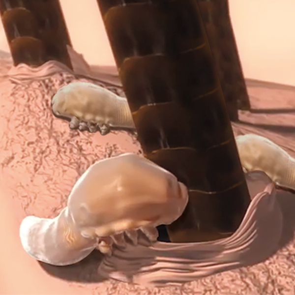 Demodex-Milben leben in den Haarfollikeln an den Haarwurzeln oder in den Talgdrüsen. Tageslicht verursacht, dass sich die Milben in den Follikeln oder Talgdrüsen verstecken, wo sie sich tagsüber von Talg und Nährstoffen ernähren, die für das gesunde Wachstum unserer Haare notwendig sind. Nachts kommen die Milben an die Oberfläche und paaren sich. Danach kehrt das Weibchen in den Haarfollikel zurück und legt dort bis zu 60 Eier ab, was unter geeigneten Bedingungen zu einem sehr schnellen Anstieg ihrer Population führen kann. Nach etwa zwei Wochen kann man sogar ein leichtes Krabbeln auf der Kopfhaut spüren.